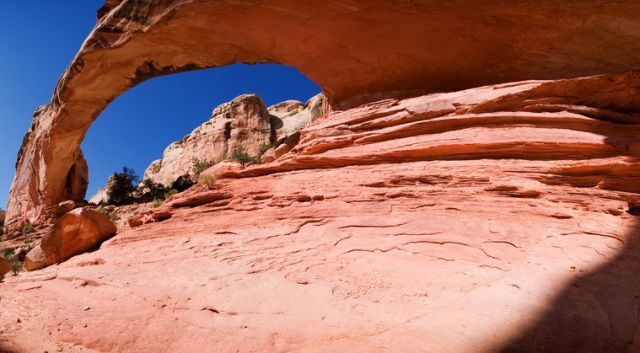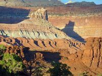 - Engagez-vous sur la Scenic Drive, vers le sud (Grand Wash et Capitol Gorge) : elle part de Fruita et offre un panorama splendide, sur entre autres, Danish Hill, les « Demoiselles »(dômes effilés, modelés dans la roche), etc. Vous tomberez ensuite sur la mine d’uranium Oyler, en ruines aujourd’hui. A partir de la route, on peut accéder à Cassidy Arch, une arche naturelle qui a abrité Butch Cassidy. Ensuite, vous passerez au milieu de mines de cuivre, puis au centre de la forêt « pygmées » de pins pignons et genévriers.