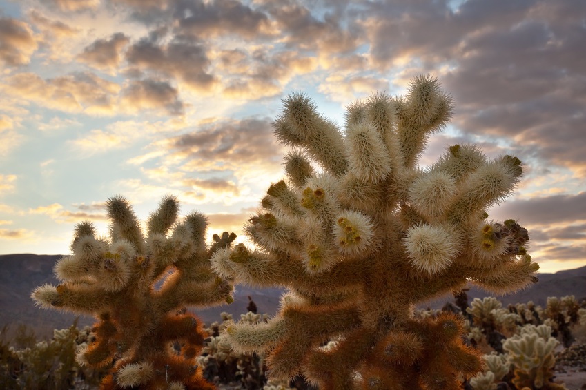 - Le désert du Colorado, s’étend au sud et à l’est du parc, en dessous de 910 mètres d’altitude. Cette partie est peuplée de yuccas, de cactus cholla et d’ocotillo. Elle s’ouvre également, au sud-est, sur la vallée Coachella, recouverte de prairies au sol sableux, et qui abrite quelques dunes de sables.