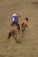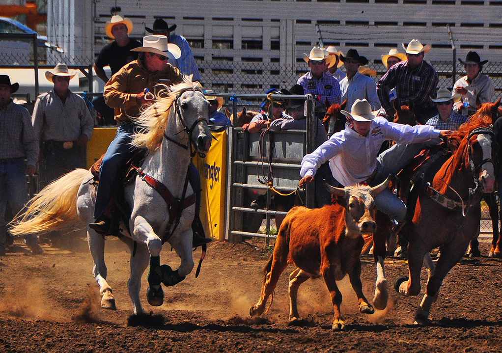 Team roping : capture au lasso en équipe. C’est la seule épreuve qui se déroule en équipe. Il y a un homme de tête (header) qui doit passer le lasso autour du cou ou autour de la tête et d’une corne du veau, puis il se tourne vers sa gauche (extrêmement important, il ne peut pas se tourner vers sa droite !!!) et un second (heeler) qui vient attacher les deux pattes arrières de la bête.