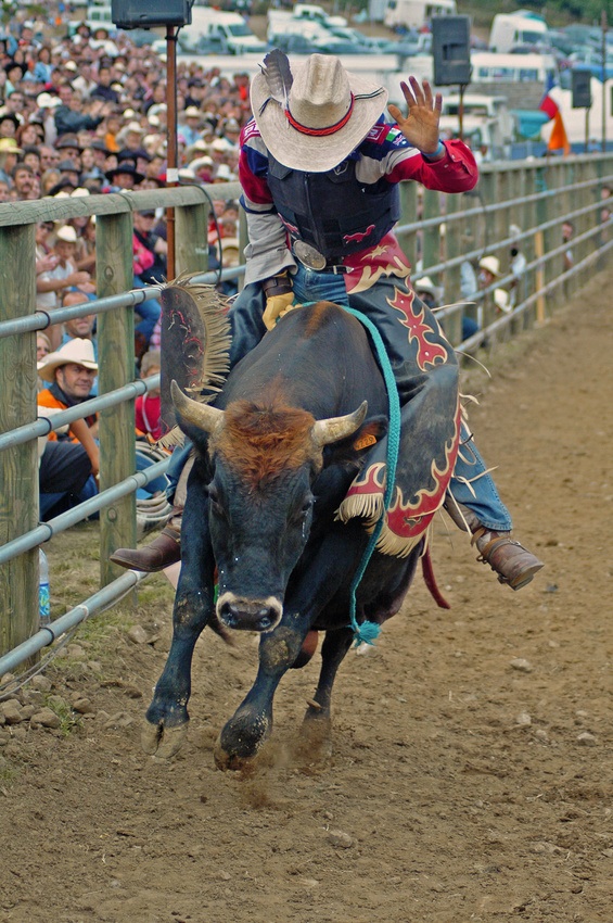 Bull riding : monte du taureau. C’est l’épreuve la plus populaire et la plus dangereuse, et donc, souvent, le clou du spectacle. Le cowboy tient une corde (bull rope) qui le relie à l’animal hyperpuissant, et doit se jeter pour terminer l’épreuve.