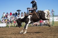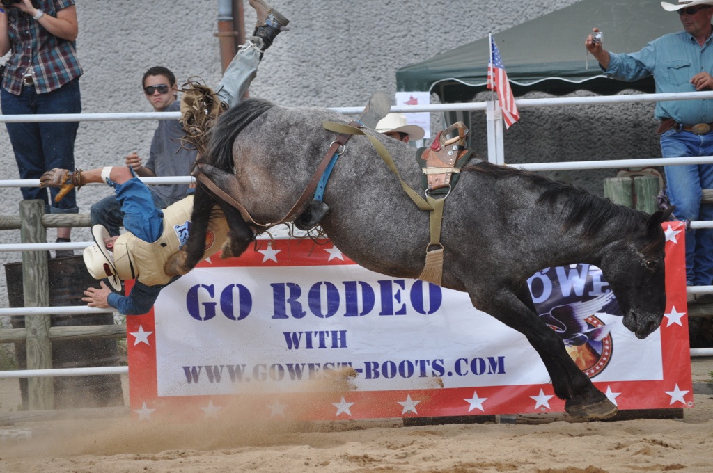 Bareback riding (rodéo de cheval sans selle) : monte à cru (sans selle). C’est souvent la première épreuve du spectacle.Saddle bronc (rodéo de cheval avec selle) : monte du cheval sauvage. Le concurrent s’accroche alors à une selle spéciale.