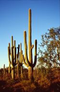 Ce cactus qui se prononce ‘Sah-wah-roh’ est du genre Carnegiea et ne comprend qu’une seule espèce. Il peut vivre jusqu’à 250 ans. Il a la particularité de gonfler et rapetisser selon la quantité d’eau qu’il a absorbée, comme un accordéon : en sachant qu'il peut contenir autour de 3000 litres d’eau et en perdre 50% en période de sécheresse, on peut imaginer que sa forme et son poids varient considérablement. Il peut peser au maximum entre 4 et 5 tonnes. Il dispose, comme de nombreux cactus, de milliers d’épines destinées à le protégéer d'éventuels 'prédateurs' mais destinés aussi à lui apporter de l’ombre. Les plus grands Saguaros atteignent jusqu’à 15 mètres de hauteur. Le plus gros actuellement observé fait 13,8 mètres de haut et 3,1 mètres de circonférence, et se trouve en Arizona. Les Saguaros fleurissent entre avril et mai.