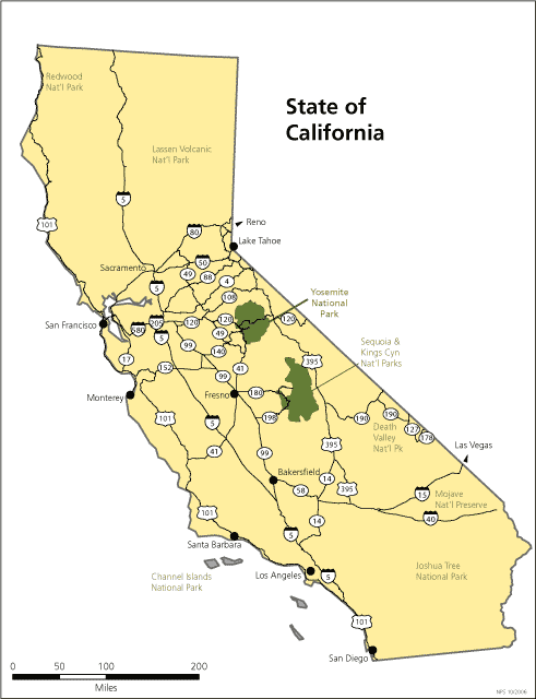 En venant de Las Vegas, prenez l’I-15 south jusqu’à Barstow, puis la Highway 58 west jusqu’à Barkesfield, puis la Highway 99 north jusqu’à Fresno, puis la Highway north 41. Cette route n’est accessible que de mai/juin à octobre.