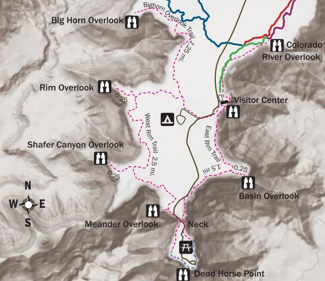 Le Dead Horse Point State Park offre près de 11 km de sentiers de randonnée entre roches et désert, reliant différents points de vue : Dead Horse Point Overlook, Visitor Center Nature Tail, The Colorado Overlook, East Rim Trail System, West Rim Trail System (le plus long) et Bighorn Overlook. La plupart sont relativement faciles.